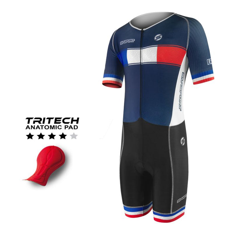 SILASPORT a créé cette trifonction avec un design qui représente votre nation favorite. Grâce à sa coupe et ses tissus, ce produit est spécialement adapté pour les courtes distances. Il possède des bandes grip aux cuisses pour un ajustement parfait. Son zip avant et ses coutures plates rendent ce produit plus confortable afin de pouvoir l’utiliser jusqu’à la distance M.