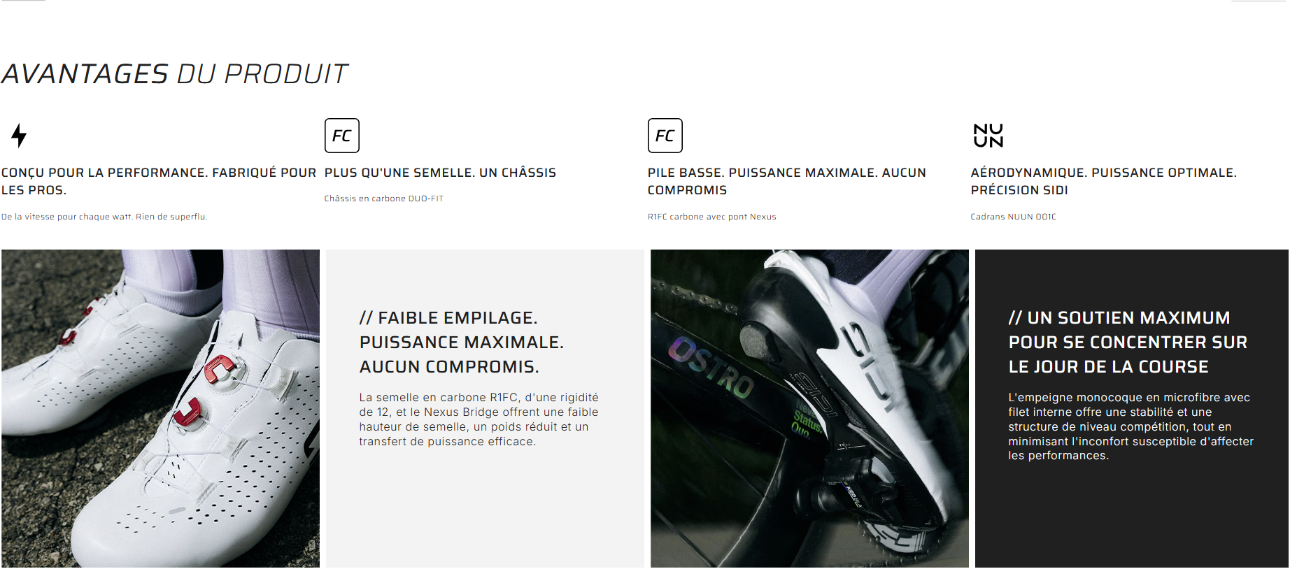 - Semelle extérieure : Carbone R1FC avec Nexus Bridge – indice de rigidité 12