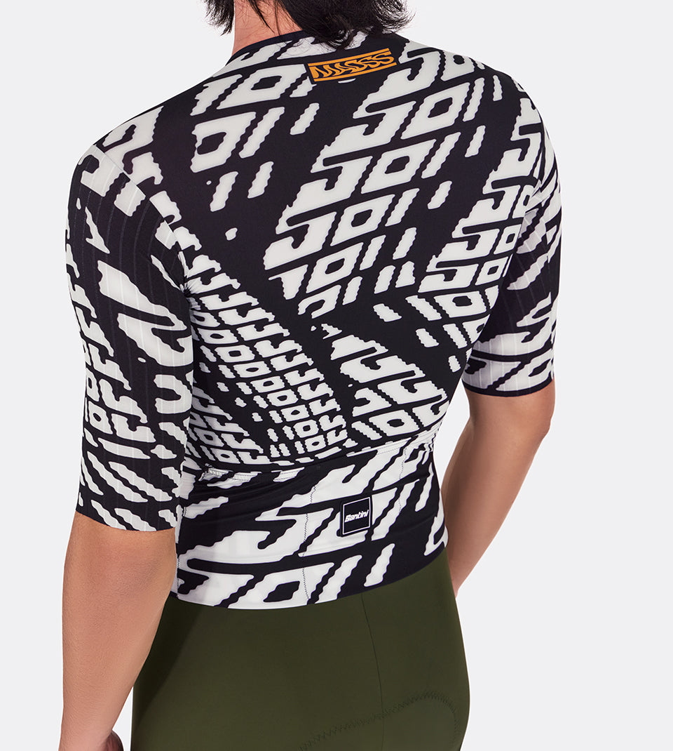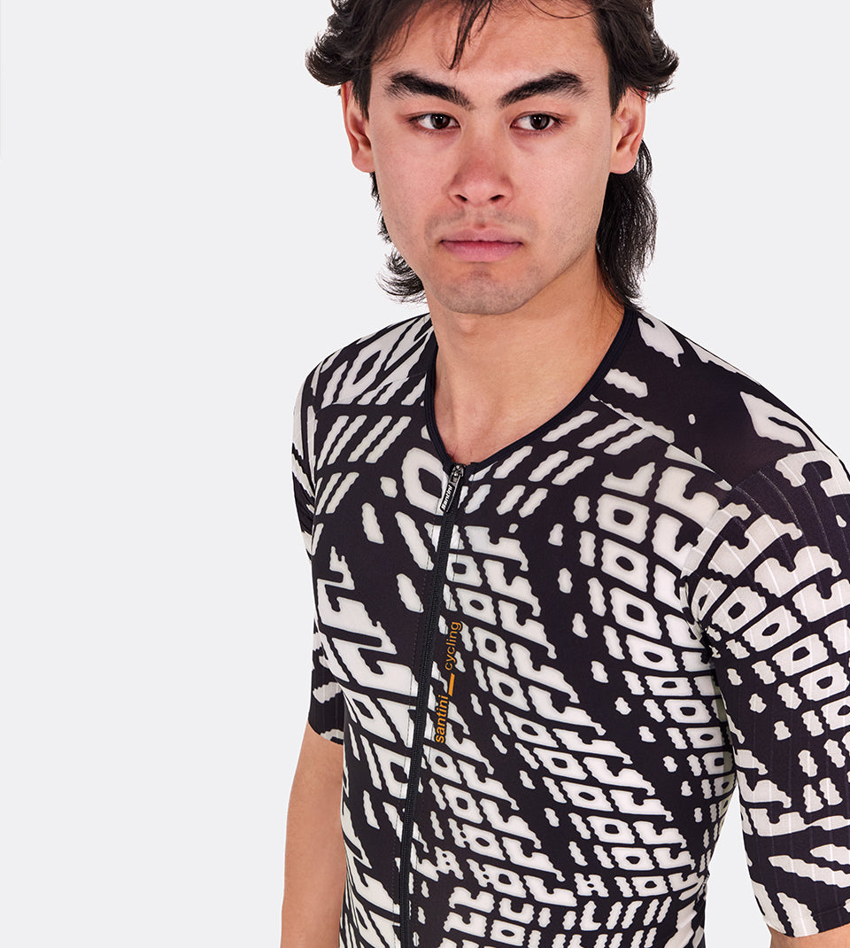 The lower part of the bodysuit is made of exceptionally durable Lycra, with a high-density textile pattern providing medium compression without restriction. The elongated legs and the grippy fabric with raw edges and internal silicone on the thighs further improve comfort and aerodynamics.