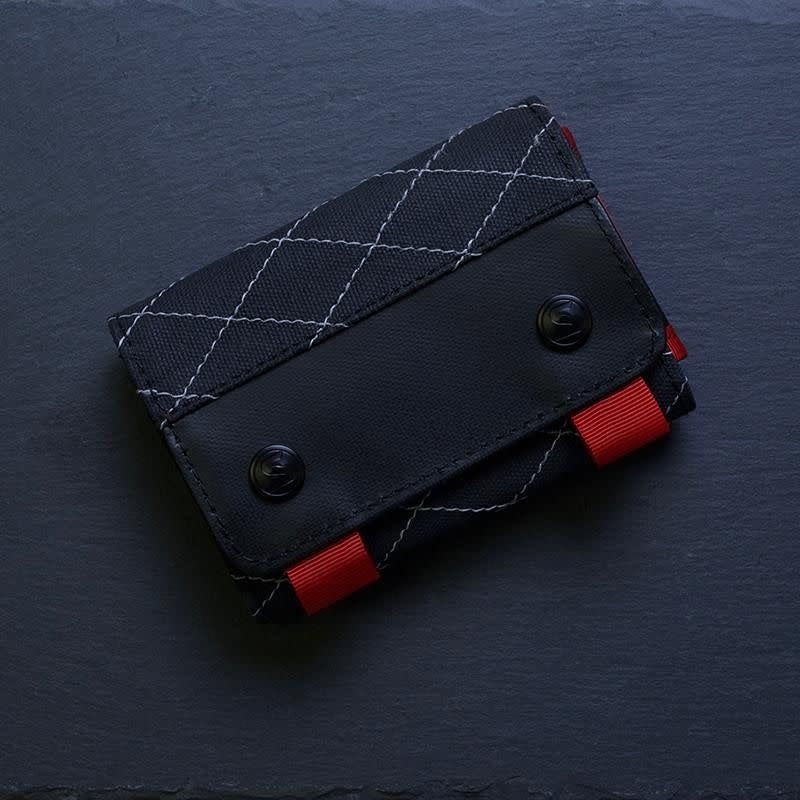 - Folding stand with reflective cross-stitch quilting and magnetic closures that also serve as a material guard when open.