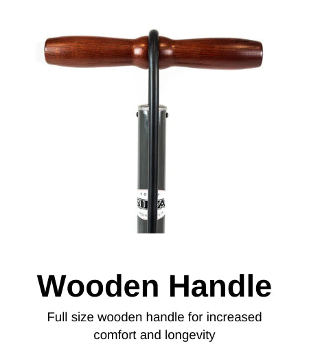 PISTA PLUS is a floor pump designed to outlast the rest of your cycling gear. The durable steel body, 3mm thick leather plunger design, combined with our exclusive brass air bridge and check valve ensure unmatched longevity. The smaller diameter barrel combined with the superior pumping efficiency of our classic 28mm Model 731 Italian leather piston seal and self-lubricating linear bearings means that PISTA PLUS is capable of easily reaching pressures up to 220 PSI. PISTA PLUS features a three-legged aluminum base and a full-size lathe-turned ash handle. The chuck on PISTA PLUS secures the chuck to the Schrader chuck allowing the rider to swap the standard chuck for our HIRO chuck or disc wheel adapter while still retaining the ability to attach the hose to the pump.