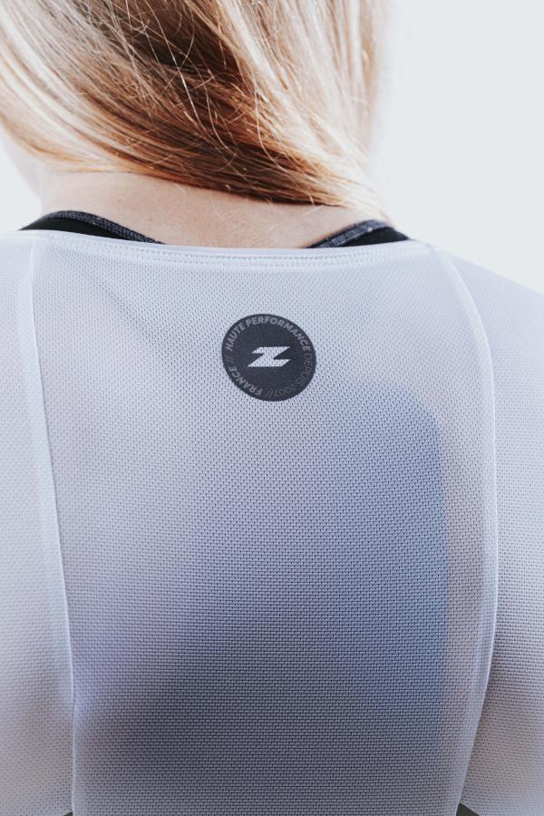 Our Ultra Light Skin fabric on the upper part (shoulder and arms) ensures great comfort and softness while the Dry Tech Mesh on the back provides lightness and ventilation throughout the race.