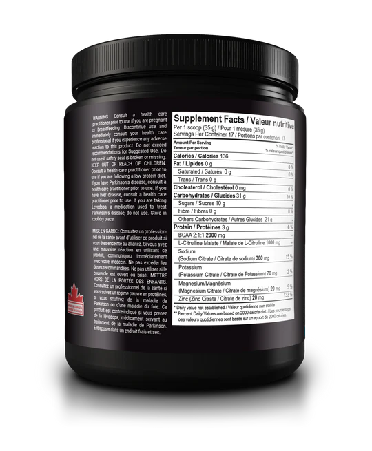 MEDICINAL INGREDIENTS : Complex Carbohydrate Blend (Dextrose, Fructose, Rice Maltodextrin, Potato Maltodextrin), Branched Chain Amino Acids (BCAA 2:1:1), L-Citrulline Malate, Caffeine, Mineral Blend (Sodium Citrate, Potassium Citrate, Magnesium Citrate, Zinc Citrate). NON-MEDICINAL INGREDIENTS: Natural color and flavors, citric acid, stevia extract, silica. NON-MEDICINAL INGREDIENTS: Natural color and flavors, Citric acid, Stevia extract, Silicon dioxide.