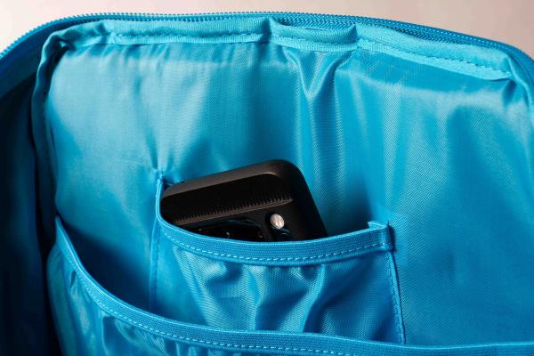 This backpack features 3 Velcro straps on the side to attach our multifunctional kit - the UT Case. It has a double zipper and a top handle with a carabiner to secure the position on the side of the bag. Inside, there is a zippered mesh pocket on one side and 6 small compartments on the other side to carry hygiene products and creams. This kit will be perfect for carrying small personal items with direct access.