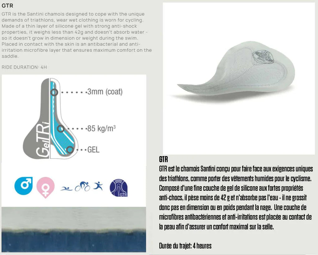 Cuissard de triathlon sans bretelles fait d'un tissu à séchage rapide. Côtés en tissus de mailles respirantes. Bandes élastiques confortables au bas des jambes qui tiennent bien en place le cuissard. Poche arrière à fermeture éclair. Élastique avec cordon de serrage à la taille pour un ajustement parfait. Chamois GTR conçu pour le triathlon.