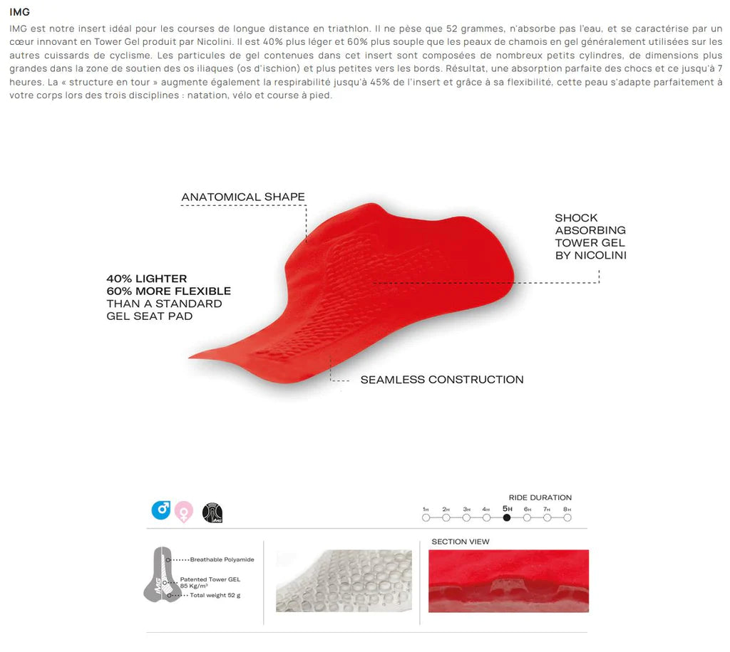 Chamois IMG (IRONMAN Gel) super-mince et à séchage rapide avec cœur en Tower Gel par Nicolini. Confortable et conçue pour toute charge d’entraînement.