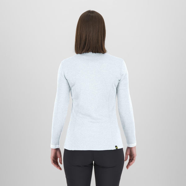 Cette voie, sur une montagne si esthétique et élancée, nous a inspiré la création du Pizzocco Half-Zip W, une polaire à demi-zip au look sobre et monochrome, sans fioritures excessives.